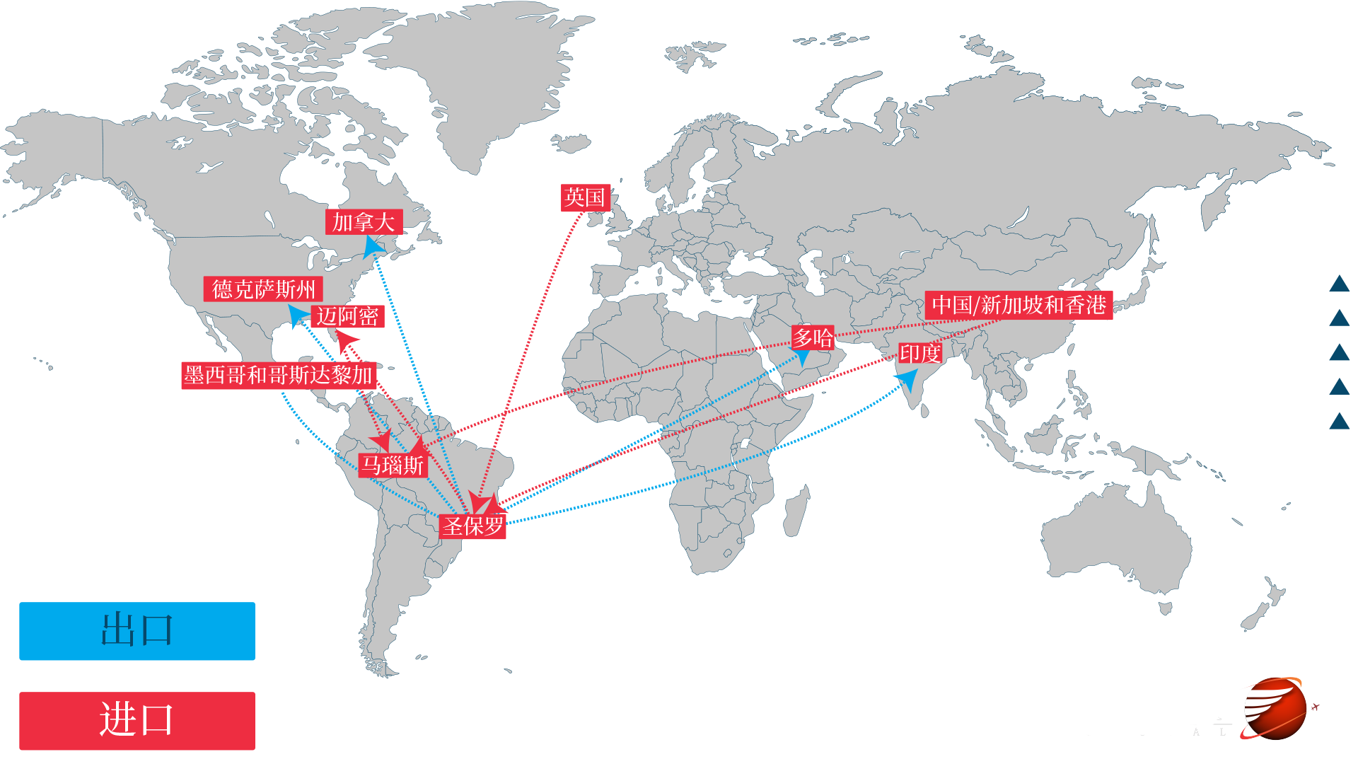 我们的业务覆盖了巴西的主要港口,此外还通过我们专门从事航空运输的公司Almex,在迈阿密机场综合体拥有自己的基础设施。我们也是UNIGROUP的成员,它是在物流和技术领域一个实力雄厚的企业集团,它确保我们在巴西主要港口的服务背后的结构,并拥有专业团队的支持。